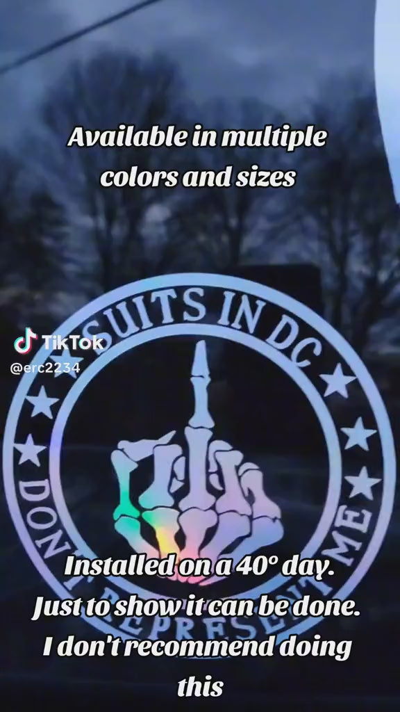 Show off your personality and make a statement with the Suits in DC don't represent Me car decal. This premium vinyl decal boasts colors that are available in a variety of options to suit your preference. With the choice of sizes ranging from 6x6 to 10x10 inches, you can place it on your car, truck, wall, window or toolbox for an added touch of creativity. The clear transfer tape ensures a smooth application process while guaranteeing that the decal won't fade or crack over time. Choose this unique and durable decal to showcase your individuality!